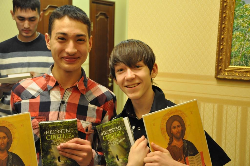 В качестве памятного дара Преосвященнейший владыка вручил каждому участнику беседы икону Спасителя и книгу архимандрита Тихона (Шевкунова) "Несвятые святые".
