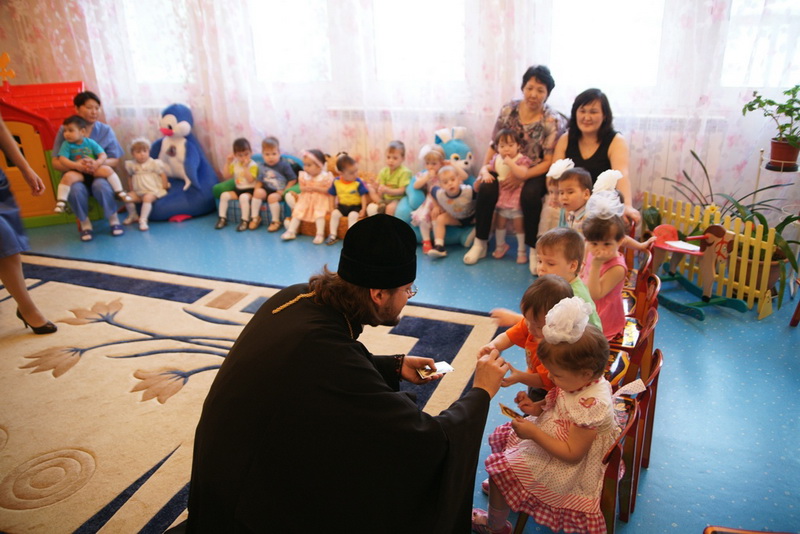 Священник передал каждой сотруднице и всем детям освященные образа со Святой Земли, привезенные Преосвященнейшим владыкой Романом из недавней паломнической поездки официальной делегации Якутской епархии.