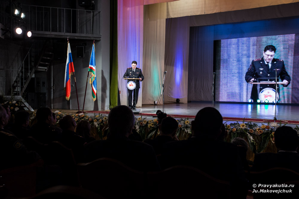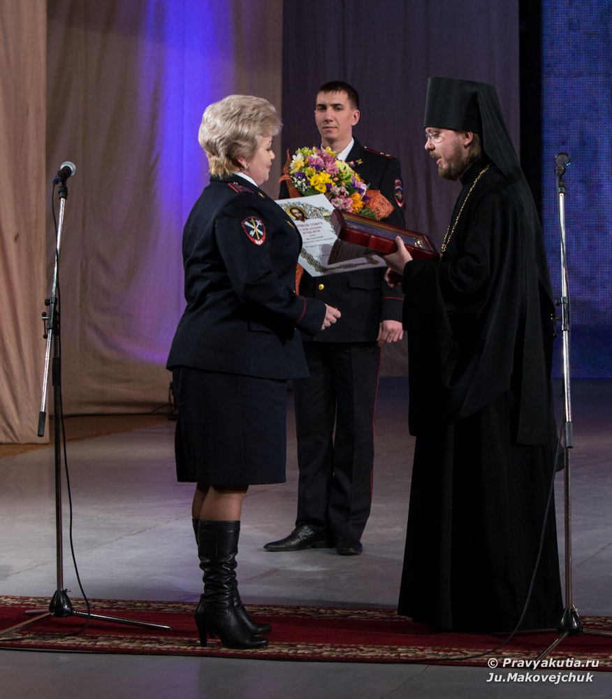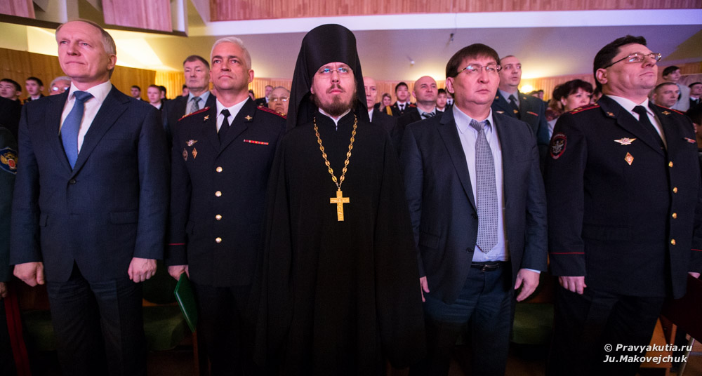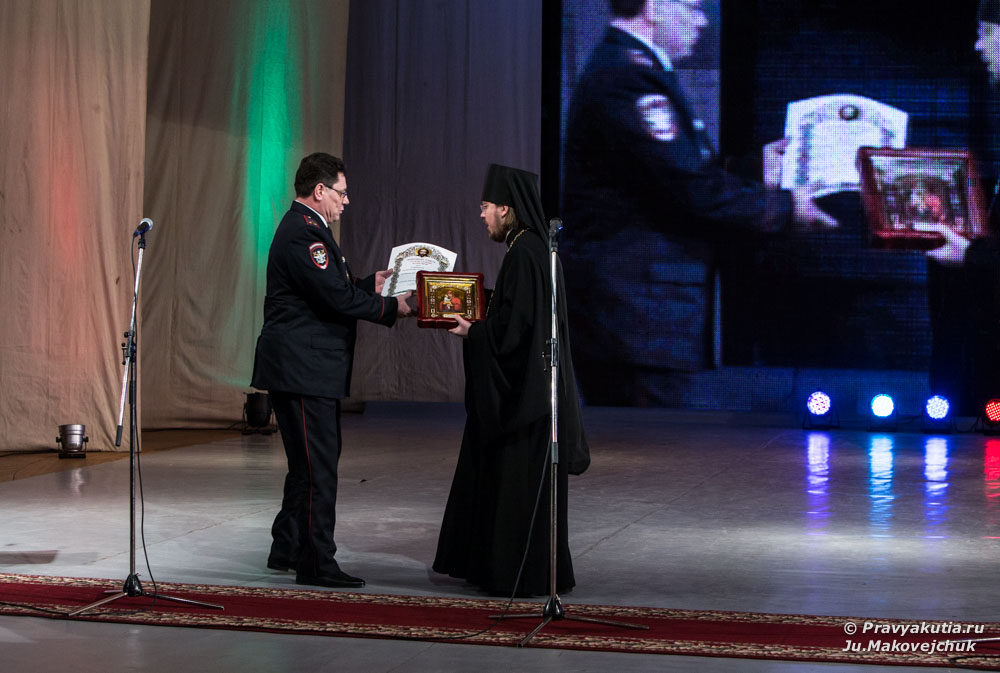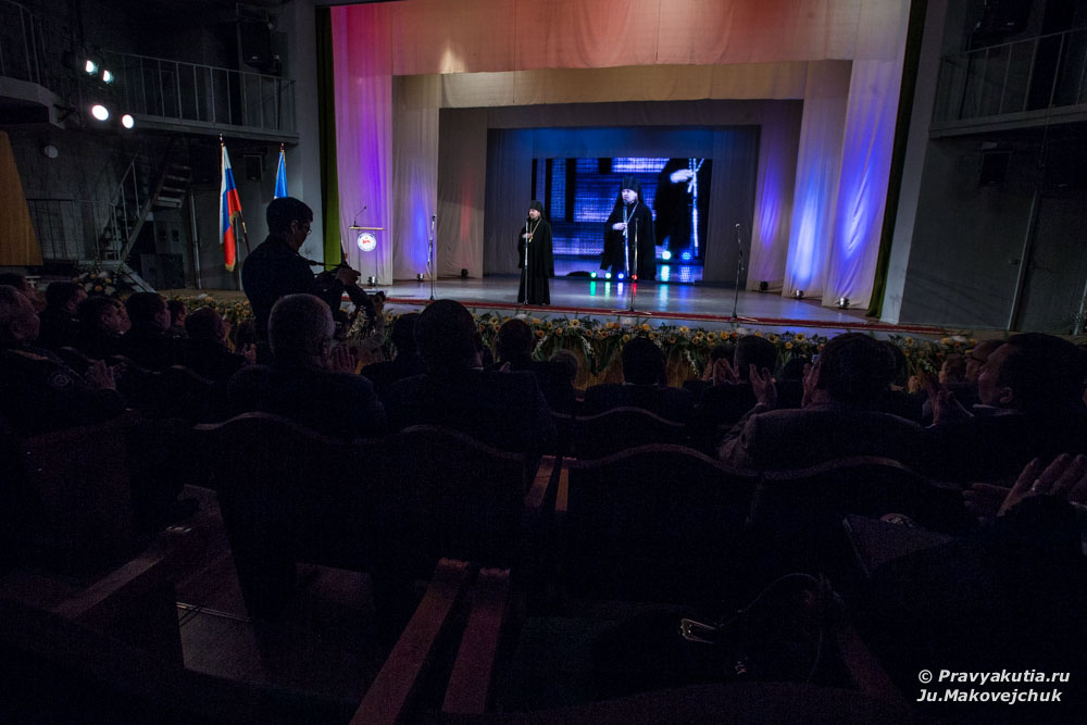 В поздравительном слове, обращенном к собравшимся, отец Никон передал слова благопожелания от епископа Якутского и Ленского Романа. "Владыка Роман, просил передать и тем, кто сегодня присутствует в зале, и тем, кто сейчас несет службу, что за всех вас ежедневно молятся. В каждом храме, за каждым богослужением. Вам надлежит охранять мир и порядок, призывать к этому граждан и гостей нашего Отечества. Бывает эта служба и опасна. Но доказанный, часто ценой собственной жизни, героизм ваших сослуживцев свидетельствует, что вам верно доверена эта ответственность - беречь нашу жизнь. Дай Бог и вам всем, молитвами близких людей быть всегда целыми и невредимыми".